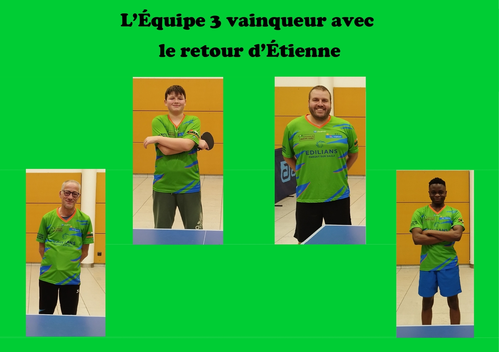 L'Equipe 3 avec Eric, Romain, Giulian et Etienne s'est nettement imposée contre ASTT TAISSY 3 à domicile sur le score de 12 à 2. 2 points laissés aux visiteurs par Romain en simple et la paire Eric et Romain. A noter le séreux des 2 jeunes Giulian et Etienne qui se sont investis complétement pour apporter 7 points à l'équipe.