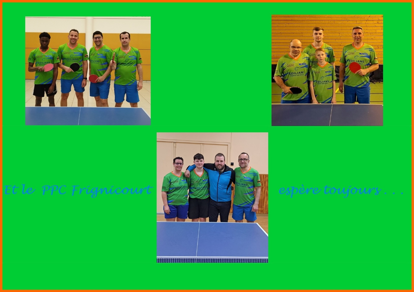 L'Equipe 1 avec Syl, Aurel, Nico et Etienne s'est imposée face à CHALONS CTT 8 sur le score de 9 à 5. Carton plein en simple pour Aurel, Nico et Etienne 3 pts chacun. Sylvain en délicatesse physiquement à pu compter sur ses partenaires pour conclure une soirée gagnante. Etienne a pris du plaisir et s'est investi à fond en simple pour nous prouver qu'il revenait très fort. L'Equipe se repositionne à la 3ème place de sa poule unique et ira défier le leader SC MESNILOIS 1 lors de la prochaine journée le VE 08/05.