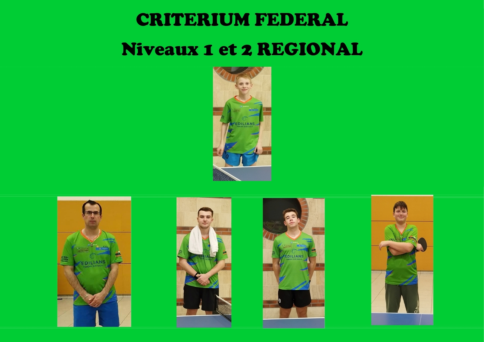 Nos jeunes évoluant en REGIONAL doivent prendre conscience des sacrifices qu'il faut effectuer pour évoluer à un haut niveau. Ils ont franchi un palier avec une belle progression dans leur classement. Le plaisir de jouer doit être primordial tout en considérant que le travail à l'entraînement paiera plus tard. On y verra plus clair dans quelques semaines !
