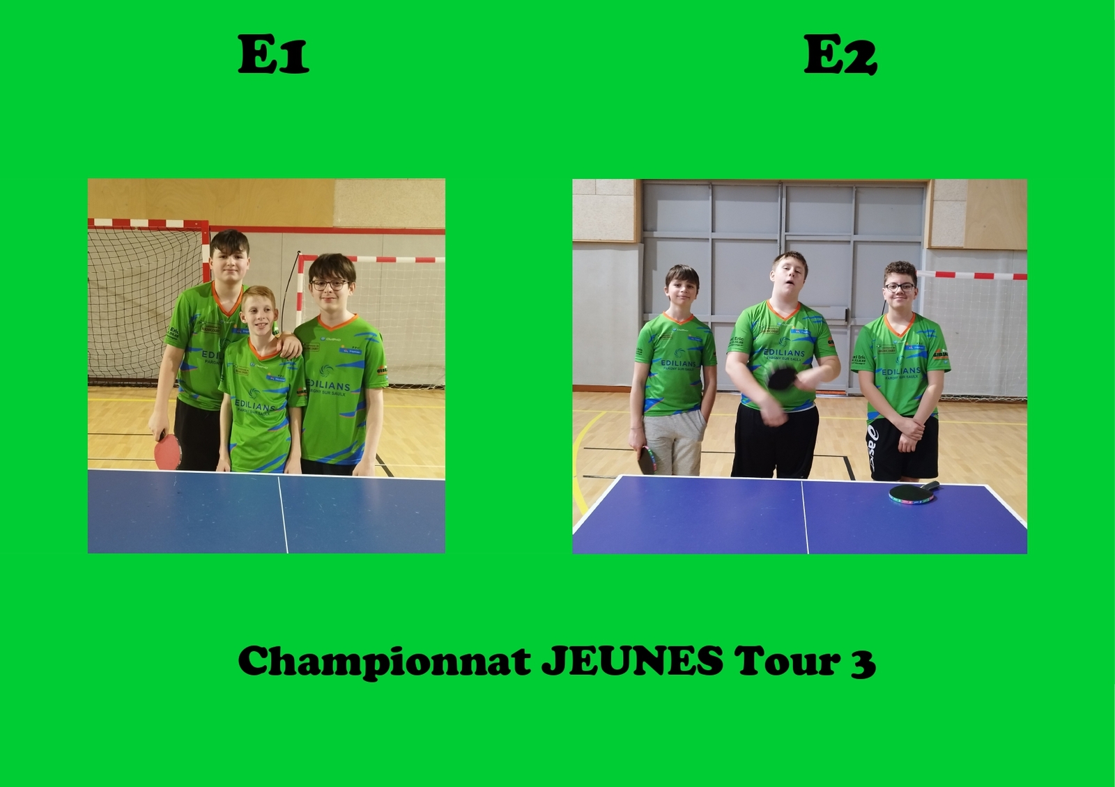 L'Equipe 1 avec LUCAS B. - GIULIAN et NATHAN termine 2ème de sa poule pour finalement obtenir une 3ème place derière les 2 équipes du CHALONS CTT. Nul doute que les prochaines confrontations seront à couteaux tirés tant les niveaux sont homogènes. L'Objectif est d'accrocher une place sur le podium !