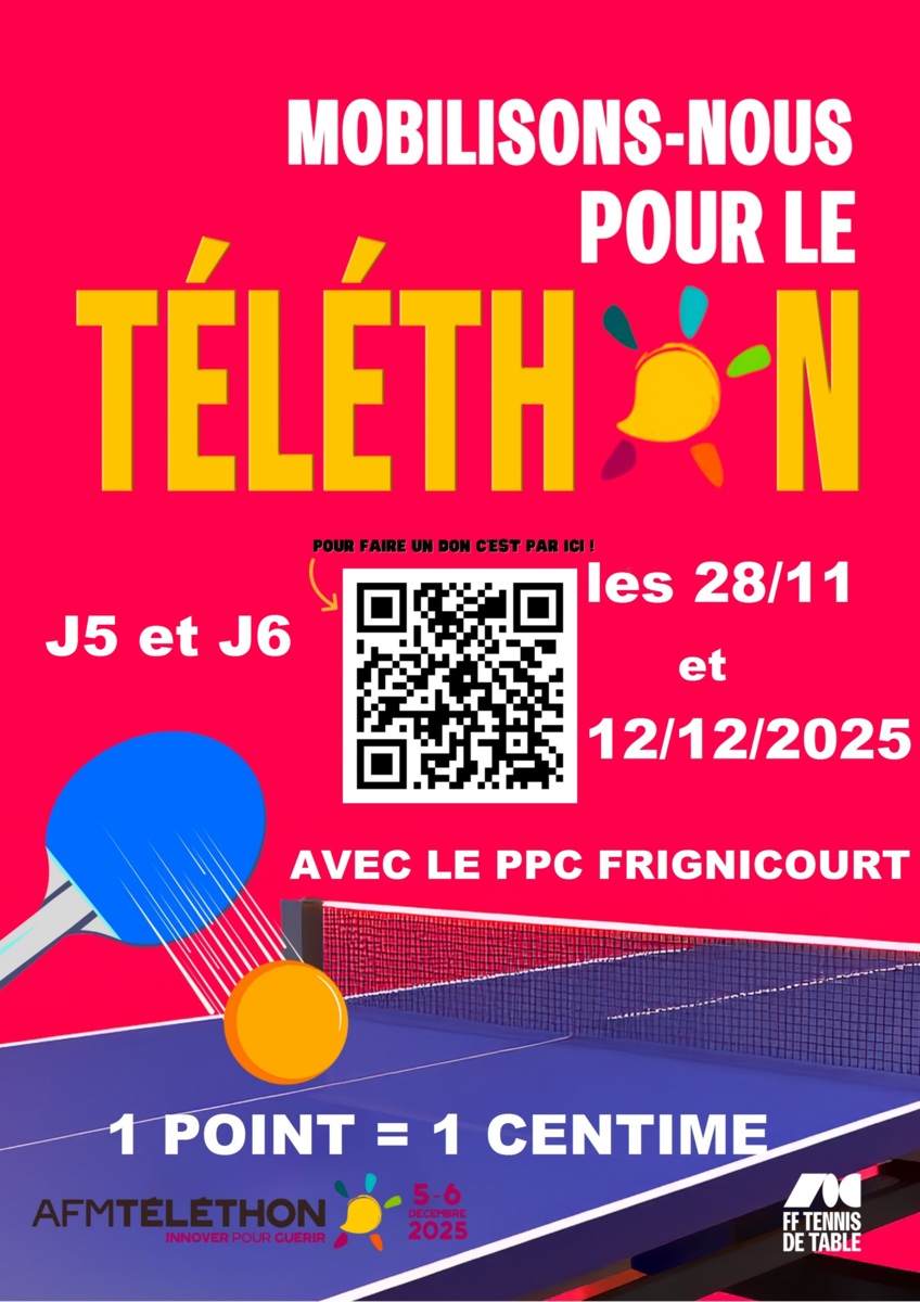 Cette action permettra de valoriser les licenciés compétitions du club afin de participer de façon simple à cette action nationale. Nous mettrons ègalement à diposition ces 2 vendredis à domicile une URNE à DONS. Un QR code est d'ores et déjà actif via l'affiche du TELETHON.