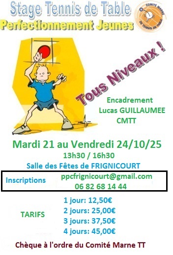 à la salle des fêtes de FRIGNICOURT de 13h30 à 16h30 ouvert aux jeunes licenciés FFTT des clubs environnants. 12 places Maximum avec comme encadrant Lucas GUILLAUMEE du CMTT. Inscriptions ppcfrignicourt@gmail.com ou 06 82 68 14 44. (Voir affiche pour les tarifs)