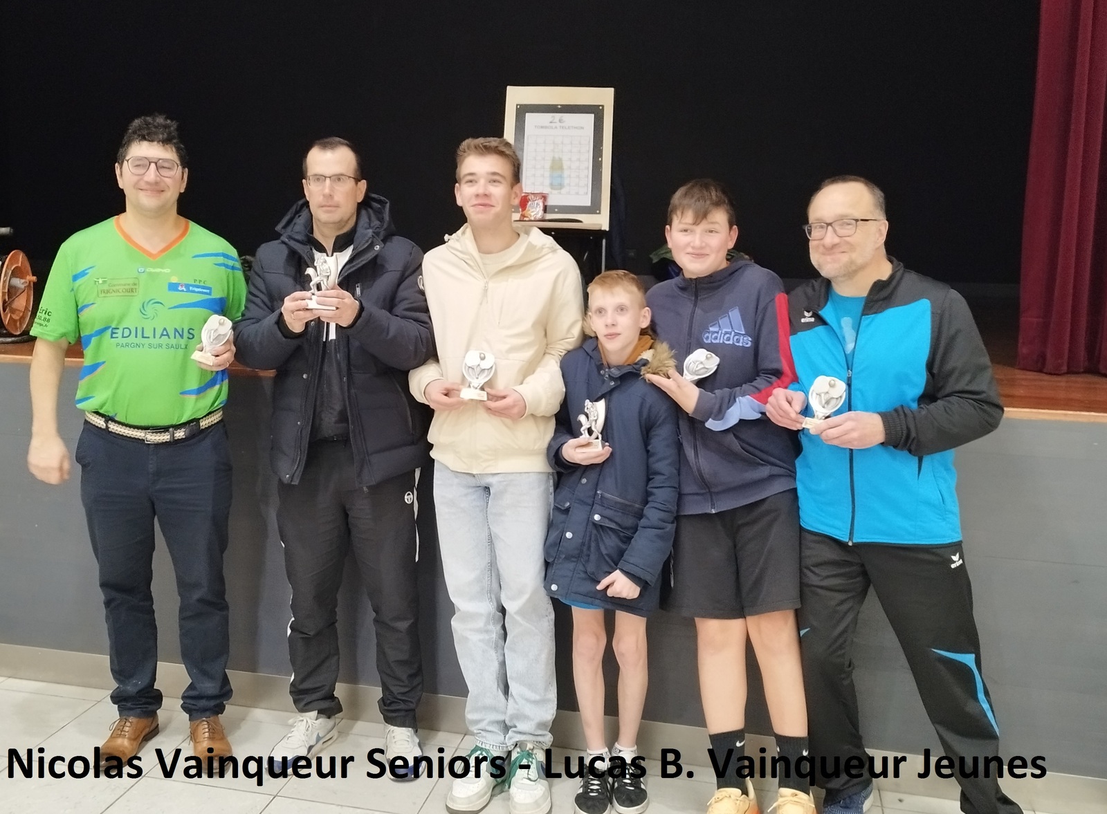 L'autre le VENDREDI 05 Décembre avec un tableau de 16 joueurs dont 1 féminine Jess et les jeunes prometteurs du Club comme Evan, Tom, Lucas B. et Giulian. Chez les SENIORS, Nicolas sort grand vainqueur devant Sylvain et Dom. Chez les JEUNES Lucas B. devant Evan et Giulian.